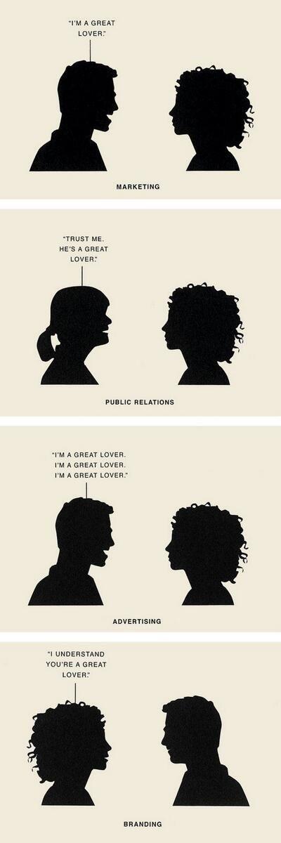 I was directed by the client to read this cringey cartoon that defines marketing as “I am a great lover” vs branding which shows the consumer saying “I understand you’re a great lover.”