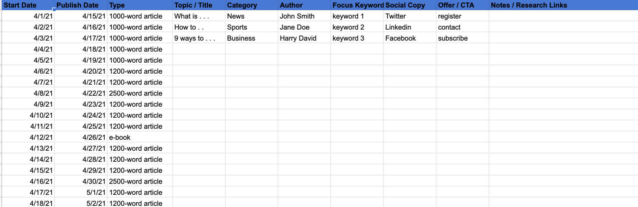 In this section, you’ll need to identify what your content calendar will look like and where it will live. Check out these content calendar templates for reference.