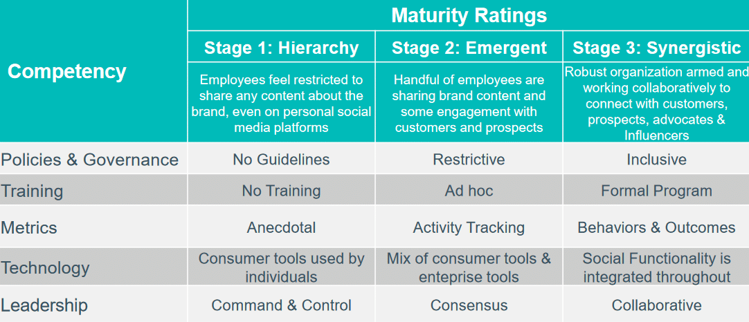 Dell is at the mature end of the spectrum when it comes to empowering their employees with social platforms. They have a well-developed training program, Dell’s Social Media University, which teaches employees who want to be a part of the program to use branded social accounts to boost their own sales numbers. Their program includes a Governance system and available help and support.