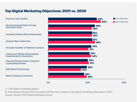 The Gartner survey focuses on big picture goals across the marketing organization. However, you might find it easier to attain goals if they are more specific.