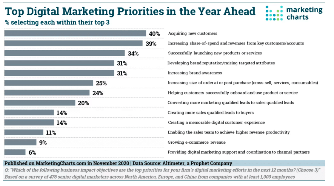 Another survey published on MarketingCharts.com from Prophet shows similar results. The priorities included acquiring new customers, increasing the share of spend and revenues, launching new products, developing brand reputation, and increasing brand awareness.