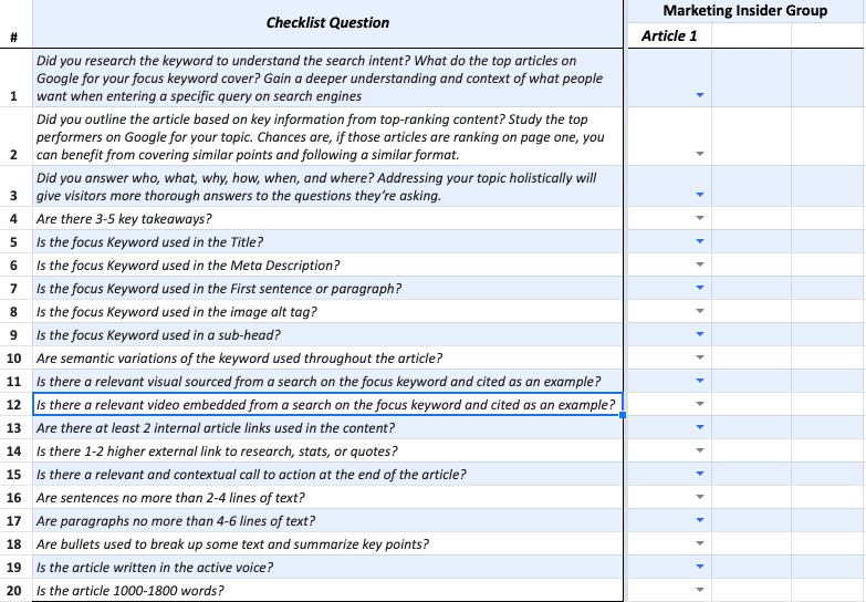 We use the following checklist for every single piece of content we deliver for our clients. Feel free to download for your own use or send me a quick message and I’ll send you a google sheet you can use.