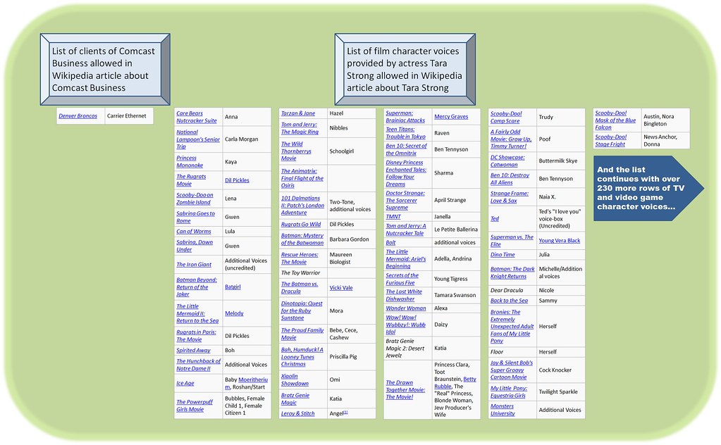 Michael, this is good stuff. I was having a hard time making a point about how unfair a couple of Wikipedia editors were being, censoring a short list of Comcast Business clients from Wikipedia’s article about Comcast Business. That inspired this infographic, and it seemed to change a few minds over at Wikipedia: https://farm6.staticflickr.com/5474/11871822903_bfb0d275cd_b.jpg